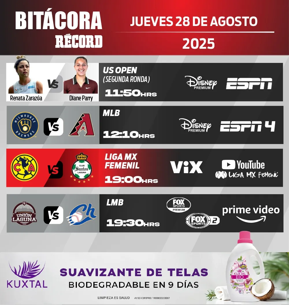 Con los ojos puestos en Nueva York. El futbol será escaso, pero tendremos actividad en México con el último partido de la Jornada 8 de la Liga MX Femenil. Además, todos los ojos estarán puestos en el Abierto de Estados Unidos con la actividad de la mexicana Renata Zarazúa, todo esto y mas en la agenda de este jueves 28 de agosto del 2025. A continuación te presentamos los partidos a seguir de este día.