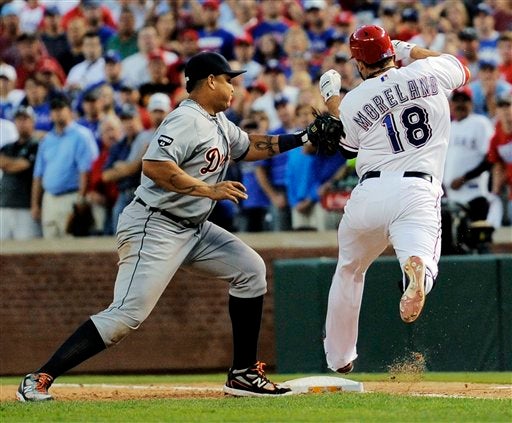 Miguel Cabrera alcanza a Mitch Moreland. FOTO: AP