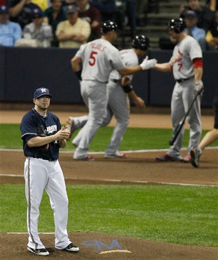 El pitcher de los Cerveceros, Shaun Marcum, mira desde el montículo a los Cardenales.FOTO: AP