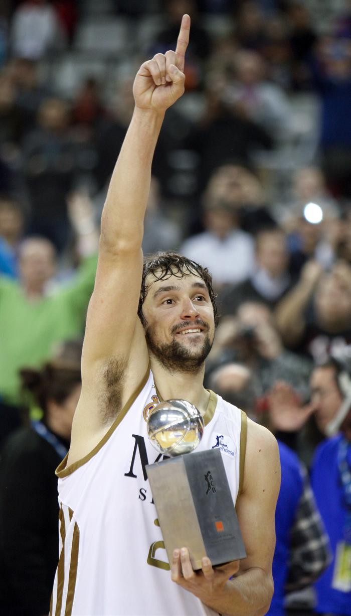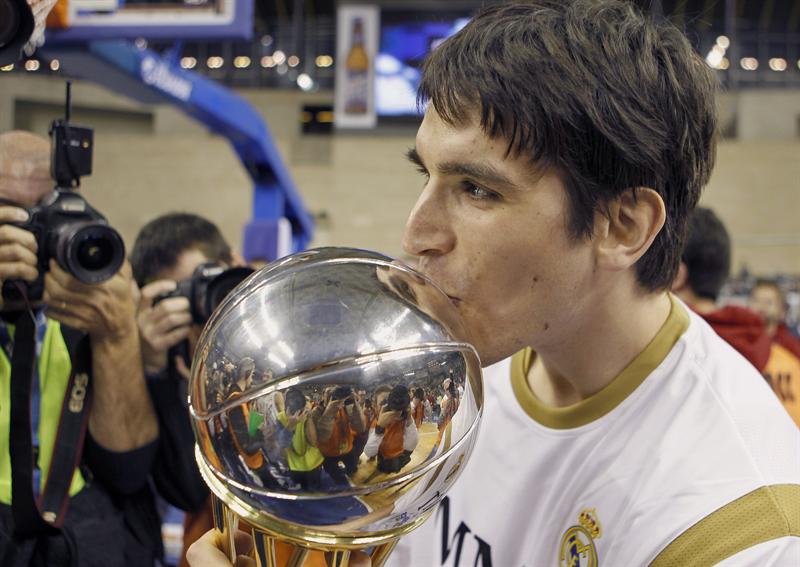 La base del Real Madrid, Sergio Llull, levanta el trofeo que le acredita como jugador más valioso. FOTO: EFE