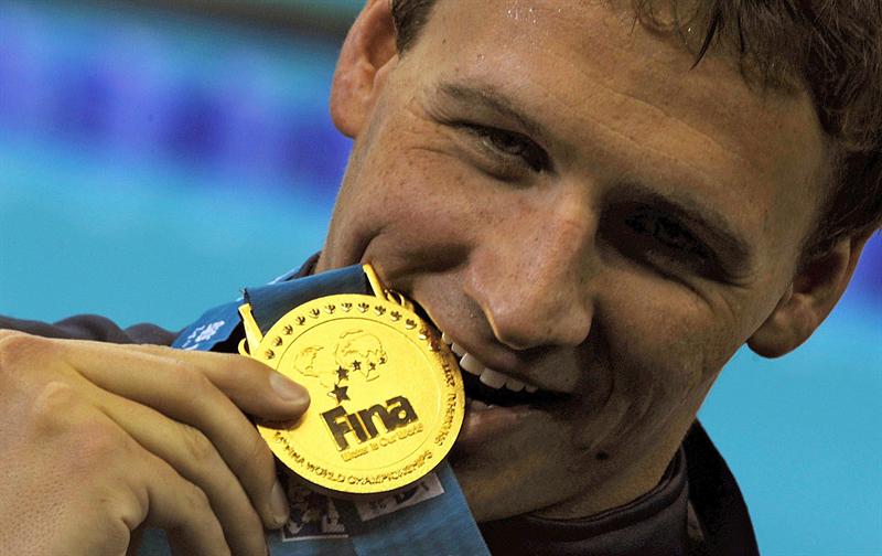 Lochte muerde su medalla de oro. FOTO: EFE