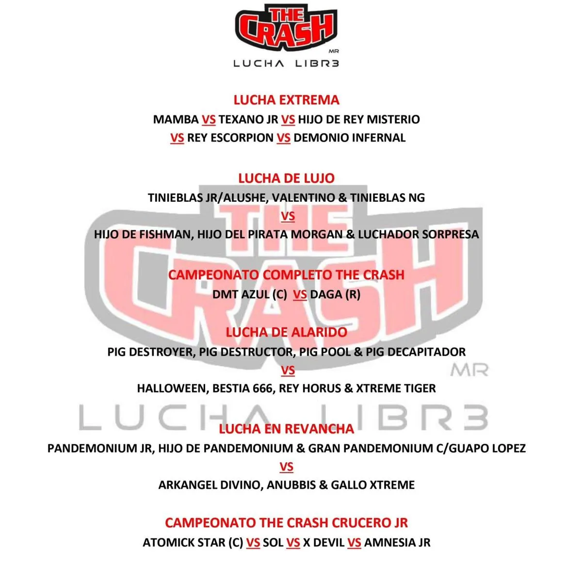 La publicación previa al anuncio de Andrade, contiene la cartelera completa del evento, en ella, se puede observar que Tinieblas Jr. con Alushe junto a Valentino y Tinieblas Nueva Generación se enfrentarán a Hijo de Fishman, Hijo del Pirata Morgan y un luchador sorpresa. Ante esta situación, los seguidores de The Crash ya han comenzado a sacar conclusiones con respecto a que precisamente es Andrade el tercer miembro del equipo.
