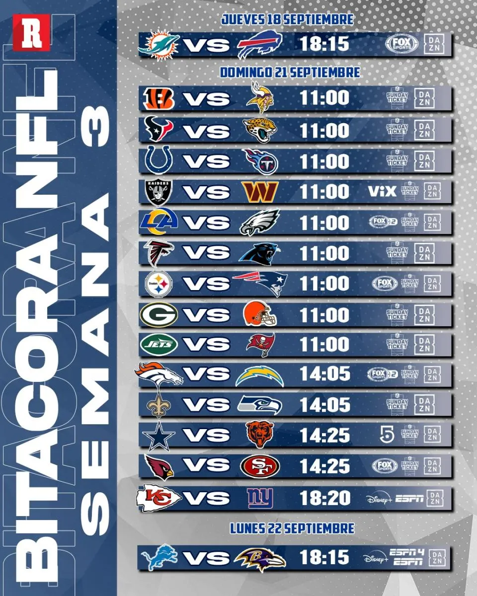 La temporada 2025 de la NFL continúa con la Semana 3, que iniciará con el juego de jueves por la noche, este 18 de septiembre y concluirá con el partido de lunes por la noche el 22 de este mismo mes. Aunque esta semana no hay partidos tan destacables, si hay varios que prometen mucho espectáculo