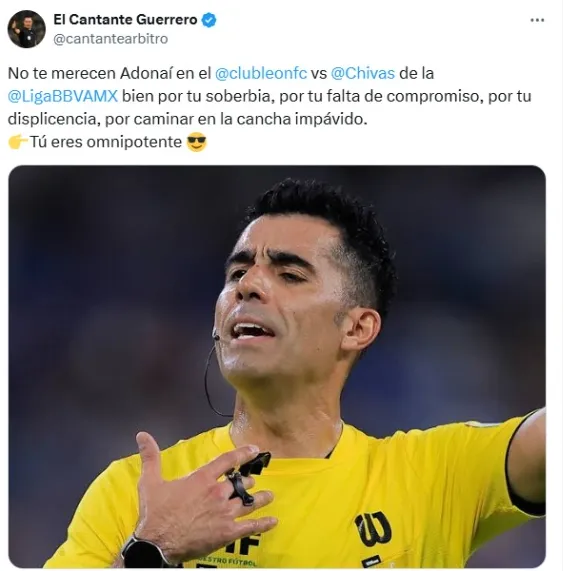 "No te merecen Adonaí en el León vs Chivas de la Liga MX. Bien por tu soberbia, por tu falta de compromiso, por tu displicencia, por caminar en la cancha impávido. Tú eres omnipotente", se puede leer en la publicación del ahora miembro de TUDN.
