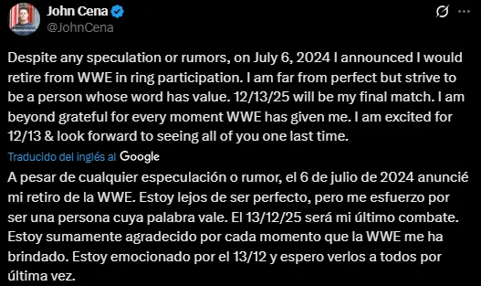 “A pesar de culturizar especulación o rumor, el 6 de julio de 2024 anuncié mi retiro de la WWE. Estoy lejos de ser perfecto, pero me esfuerzo por ser una persona cuya palabra vale. El 13/12/25 será mi último combate, mencionó en primera instancia.
