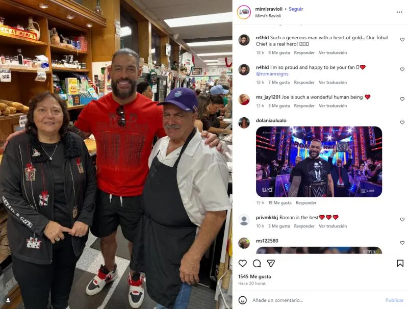 A través de redes sociales, la pizzería Mimi's Ravioli ha dejado saber que Roman Reigns recientemente visitó su sucursal para comprar muchas pizzas y posteriormente ir a repartirlas a hospitales y lugares de escasos recursos; los mismos dueños del lugar han dejado un mensaje de total admiración y respeto para el 'OTC'.