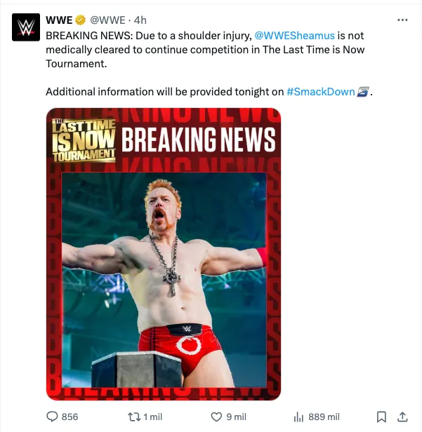 Aunque el comunicado es muy corto, WWE ha anunciado que Sheamus no está medicamente dado de alta para poder seguir en competencia en el torneo The Last Time is Now debido a una lesión en el hombro, pero no se especifica cuál es la gravedad, solamente se expresa que no podrá continuar en la competencia por ese puesto del próximo 13 de diciembre.