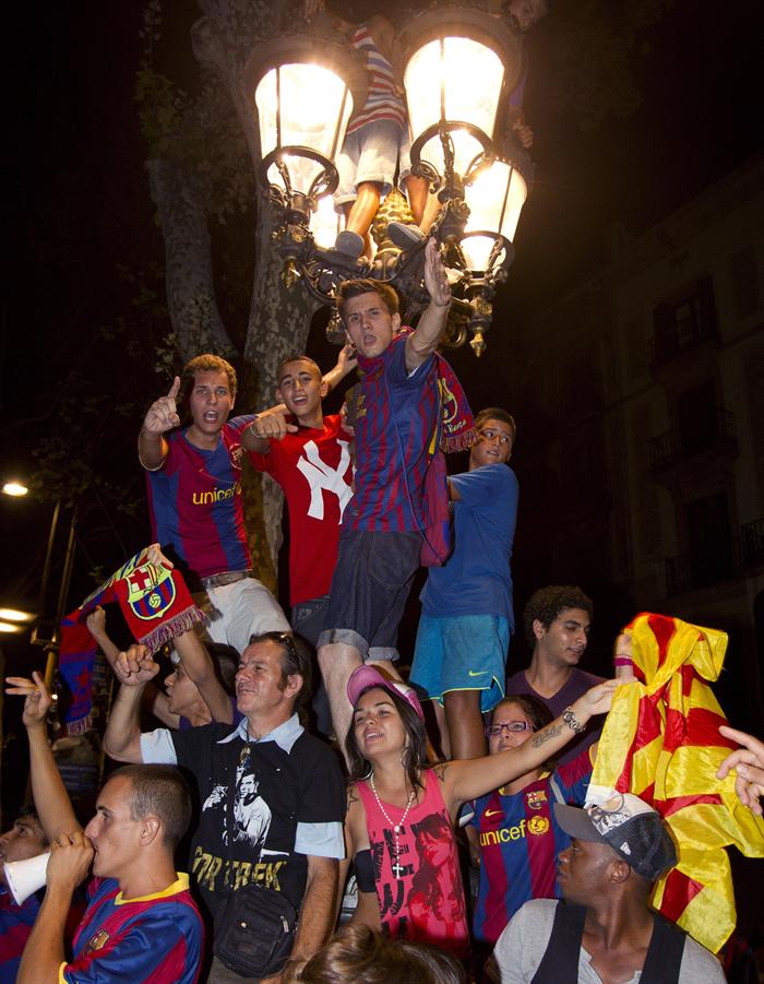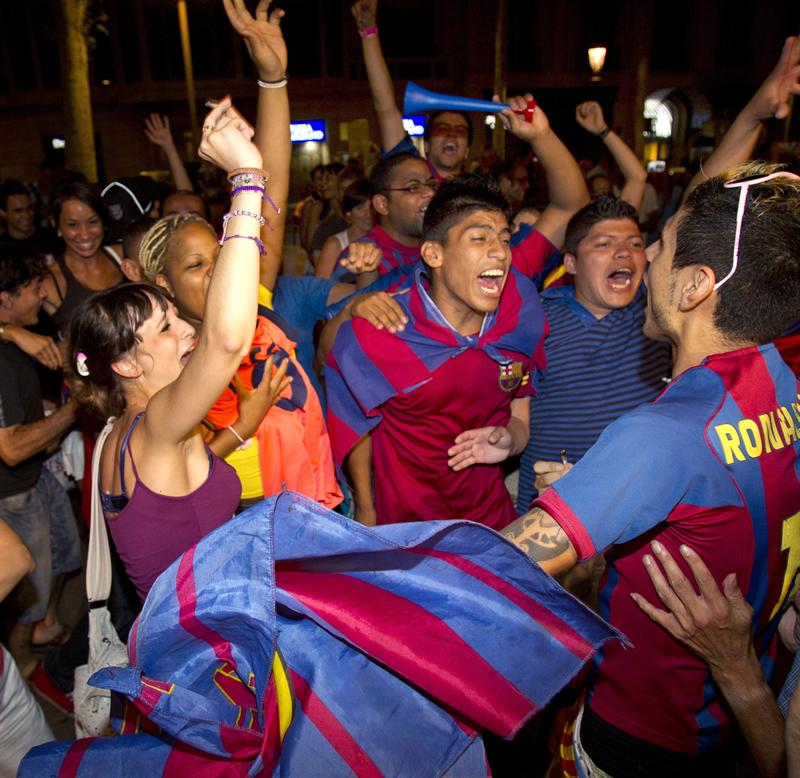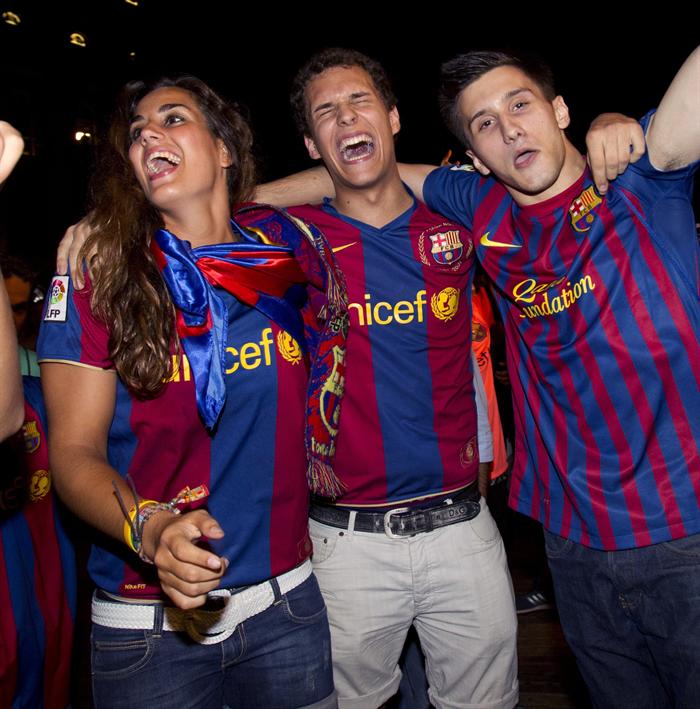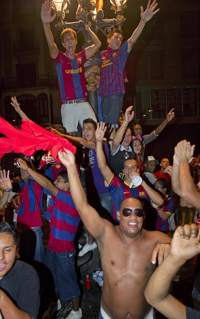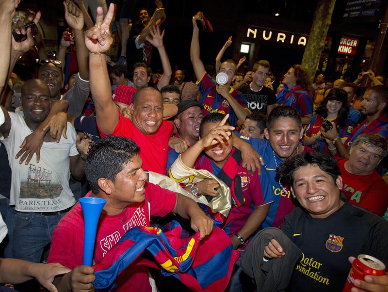 Los aficionados festejan en las calles de Barcelona. FOTO: EFE