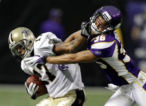 Robert Meachem rechaza al vikingo Brandon Burton. FOTO: AP