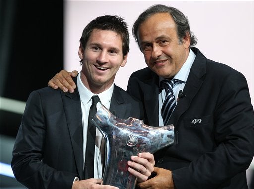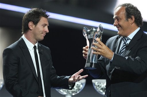 Messi recibe el trofeo como el mejor jugador de Europa en la UEFA Champions League. FOTO: AP