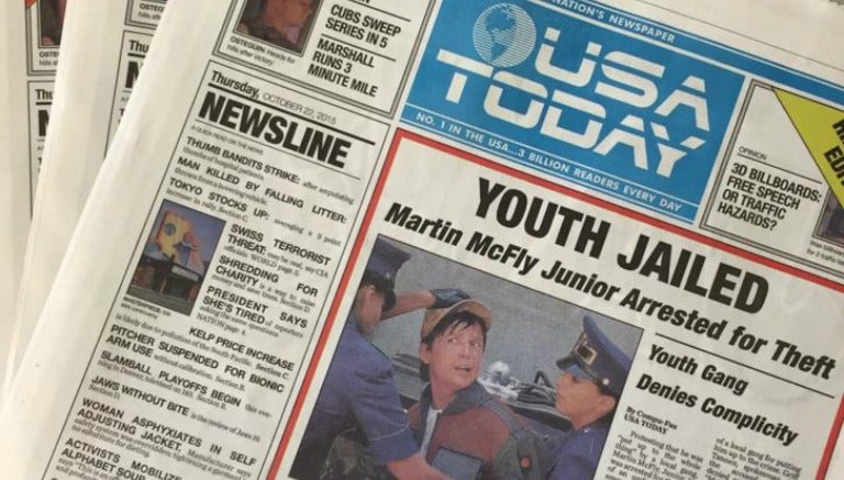 Esta 'tapa' del USA Today puede ser adquirida en la página de internet del famoso periódico americano. En ella se replican las noticias de la edición de Hill Valley, tal como aparecieron en la película estelarizada por Michael J. Fox y Christopher Lloyd.